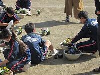 本日の昼休み、全校生徒で昇降口に置く鉢にパンジーの花を植え替えました。