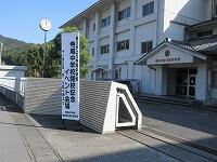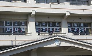 昇降口の上には「大好き寺尾中学校79年間ありがとう」の文字があります。