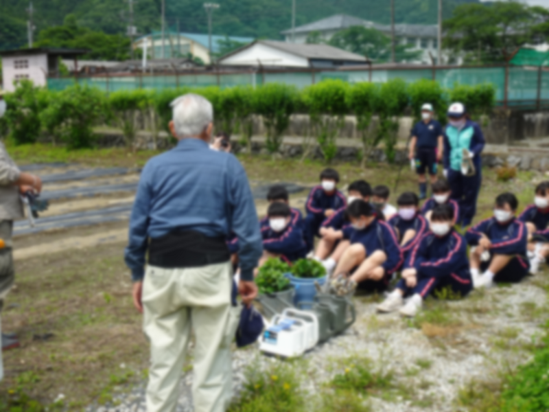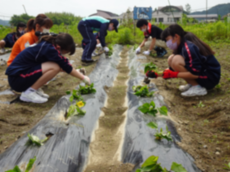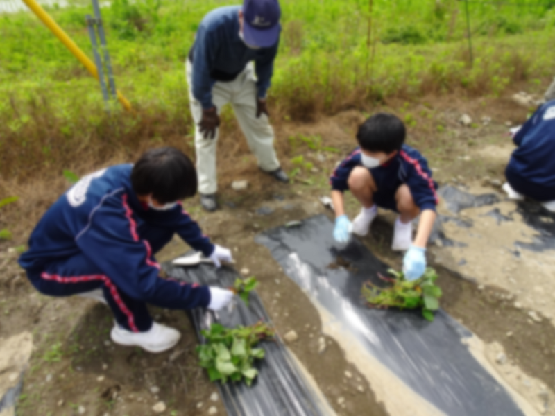 今日の2,3時間目の2年生の技術科の授業(栽培分野)で、さつまいもの苗植えを行いました。地元の農家の方に、苗の植え方の指導をいただきながら、約1時間で150本の苗を植えました。元気に育ってくれることを願っています。途中近くの草むらからタヌキも姿を見せてくれまして、寺尾の豊かな自然を感じながらの授業となりました。なお、このさつまいもは10月下旬の技術の時間に収穫し、11月上旬の家庭科の時間に調理実習で使用する予定です。