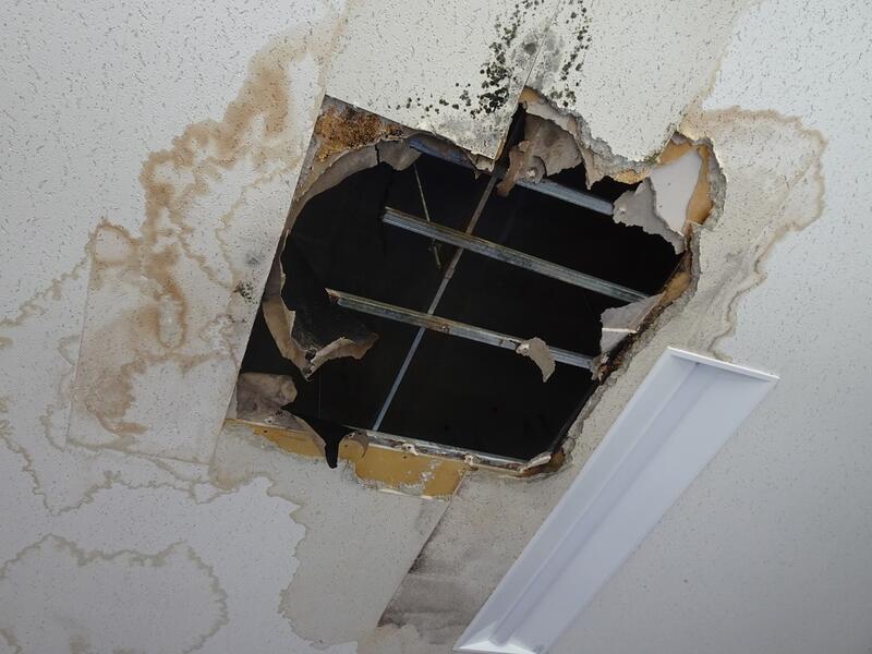 足場が組まれこの後屋根の工事が 雨漏りで崩落した教室の天井