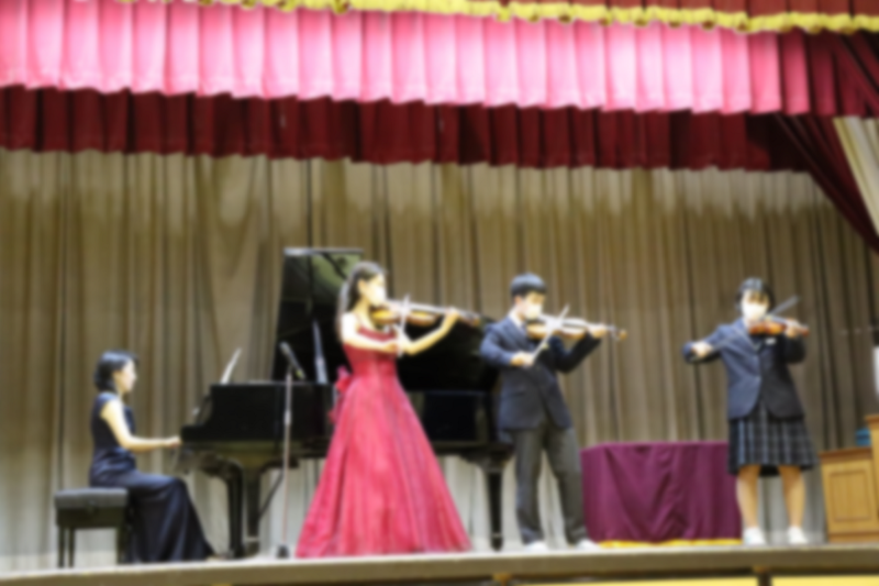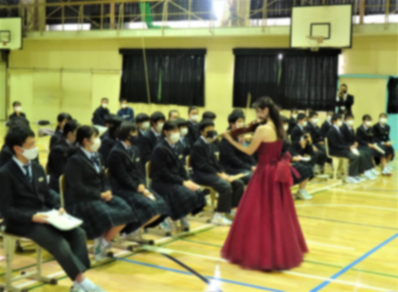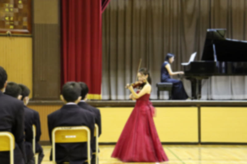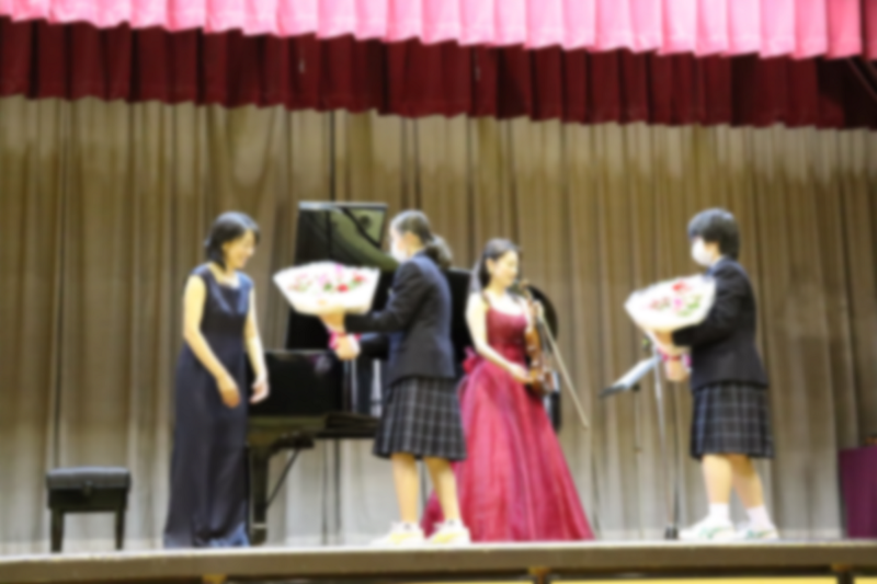 カノン、愛の挨拶、ツィゴイネルワイゼン、ラデツキー行進曲などのクラシックの名曲を生演奏で聴かせていただいたほか、代表生徒とのヴァイオリン演奏体験の時間や全校合唱とのコラボレーションも行っていただき、とても優雅な時間を過ごすことができました。優れた芸術文化に触れることで、情操教育の一環にもなったと思います。前田様、高際様、お忙しい中、素敵な演奏をお聞かせいただきありがとうございました。
