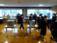 12月1日(木)、次年度の生徒会役員を決める選挙が行われました。投票に先立ち、立候補者による立会演説会が行われ、それぞれが抱負を発表しました。誰が選ばれても次年度の生徒会を立派に運営してくれると思わせる、立派な演説でした。その後、生徒からは立候補者への質問も出るなど活発な意見交換がされました。演説会の後、投票場所に移動し、投票を行いました。