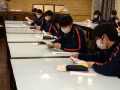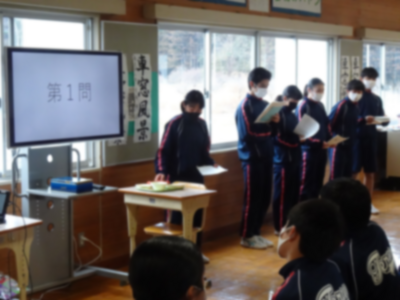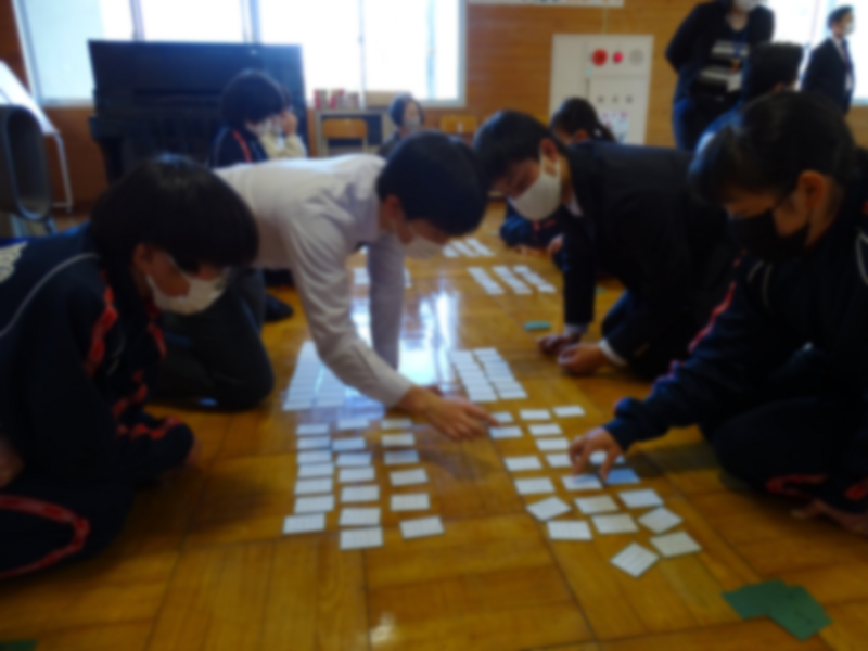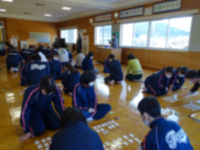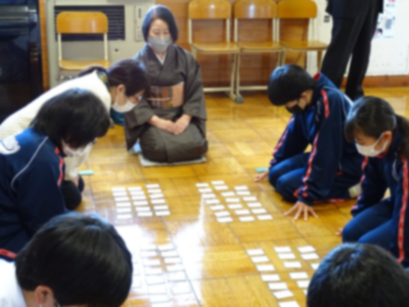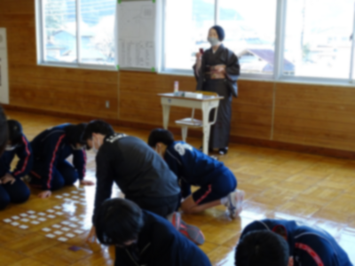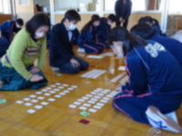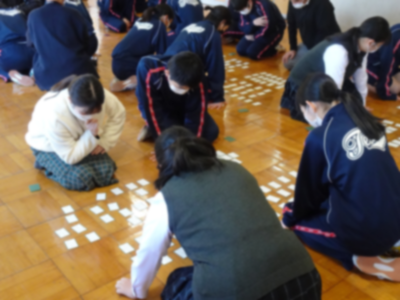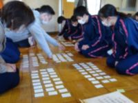 去る1月11日(水)、新春恒例の校内百人一首大会を開催しました。3学年+教職員+学校支援ボランティアの地域の方混合で4人グループをつくり、競いました。各学年月1回、学校支援ボランティアの地域の方にいらしていただいて、百人一首に親しむ活動を行っているだけに、いくつかの句を覚えている生徒も多く、白熱した大会となりました。