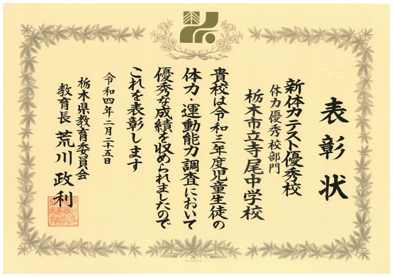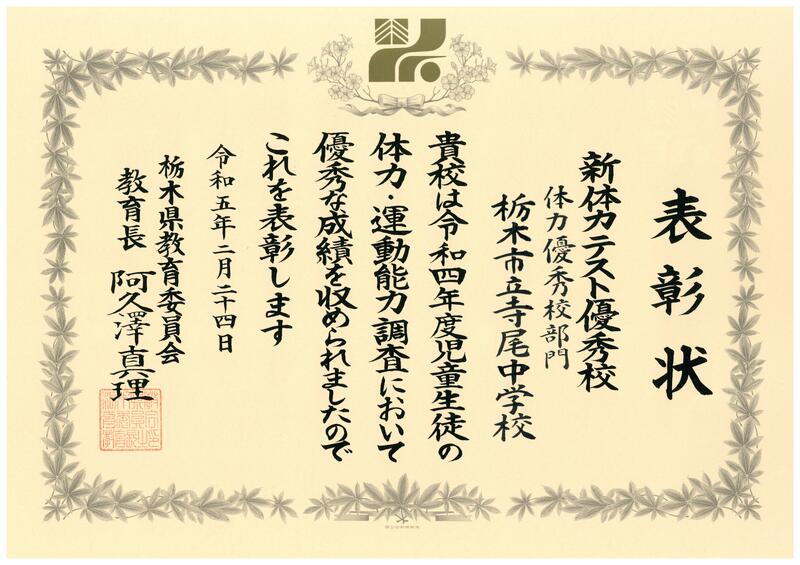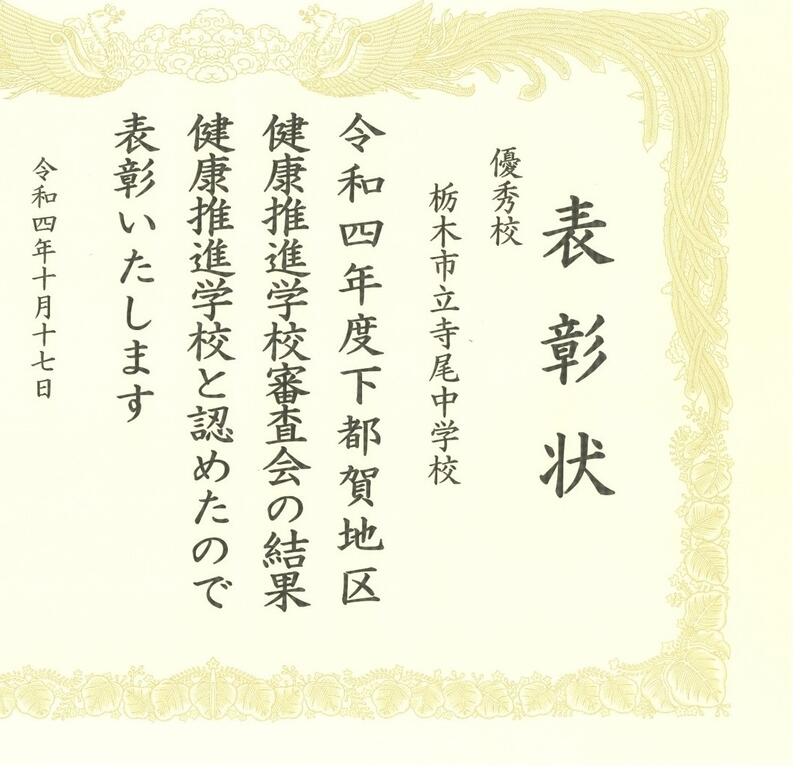 本校は、令和4年度下都賀地区健康推進学校審査会において健康推進学校と認められ、中学校の部で優秀校に選出されました。栃木市内の中学校で表彰されたのは唯一本校だけです。これは、本校学区の健康課題を明確にした上で、日頃から寺尾小学校と本校が連携して行っている様々な健康推進に関する取組が高く評価されたものと、大変嬉しく思っております。今後とも、本地区の児童生徒が心身ともに健康に成長していくよう小学校と連携して取り組んでいきたいと思います。