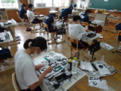 夏休み前の7月14日(木)、地域の書家の先生にお越しいただいて各学年で書道の授業を行いました。事前に下書きを朱墨で直していただいた上で、今日が清書です。書道展出品用の作品と校内展示用の作品を各1枚ずつ仕上げました。夏休みの宿題が一つ終わりました。