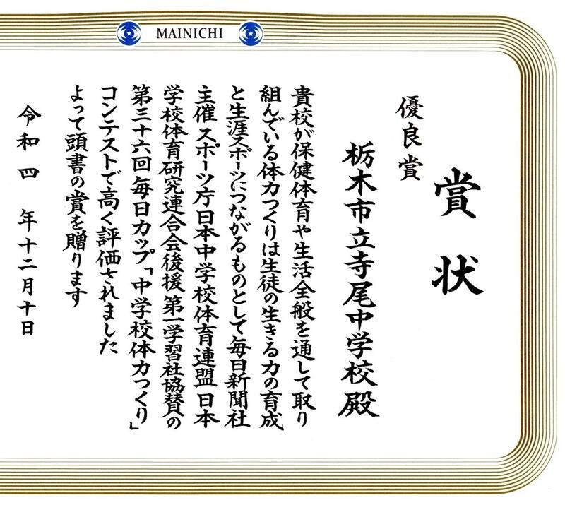 栃木県教育委員会より、昨年に続いての「新体力テスト優秀校」表彰