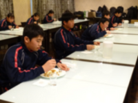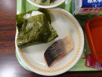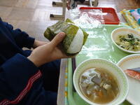 給食だよりによれば、我が国の学校給食の起源は、今から134年前の明治22年に、山形県のある小学校で、お弁当を持ってくることができない子どもたちのために、おにぎりと塩鮭、漬物を昼食に出したのが始まりだそうです。それにちなんで、校内給食週間初日の1月23日(月)の給食は大変珍しい「おにぎり給食」でした。自分でご飯を握って、パリパリの海苔を巻き、鮭をおかずにしておいしくいただきました。とてもよい企画だと思いました。