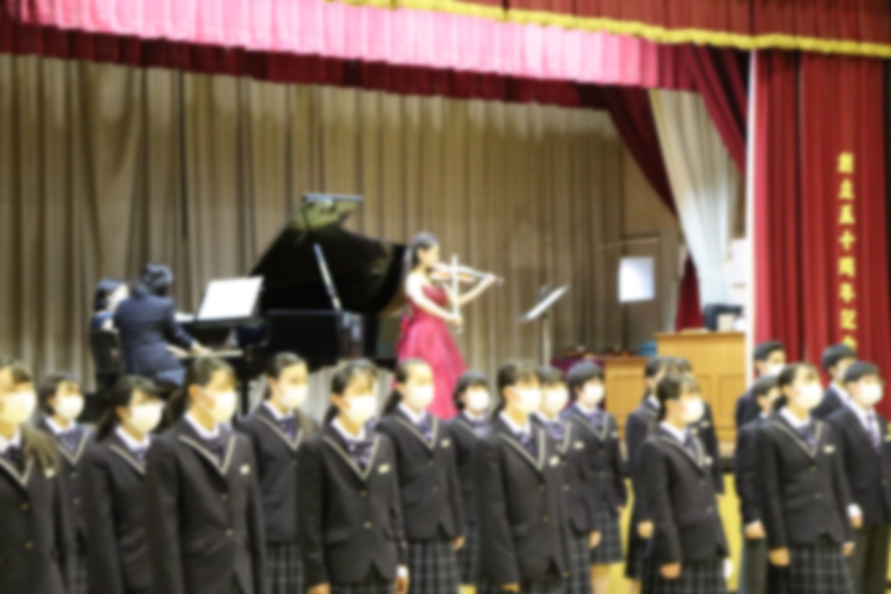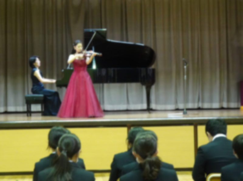 カノン、愛の挨拶、ツィゴイネルワイゼン、ラデツキー行進曲などのクラシックの名曲を生演奏で聴かせていただいたほか、代表生徒とのヴァイオリン演奏体験の時間や全校合唱とのコラボレーションも行っていただき、とても優雅な時間を過ごすことができました。優れた芸術文化に触れることで、情操教育の一環にもなったと思います。前田様、高際様、お忙しい中、素敵な演奏をお聞かせいただきありがとうございました。