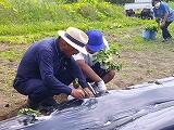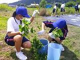 2年生が、技術科の授業の一環で、さつまいもの苗を植えました。秋には家庭科の時間を使い、収穫したさつまいもでスイートポテトを作る予定です。苗植えや収穫、そして調理実習も、地域の方にもご協力いただいて行っています。