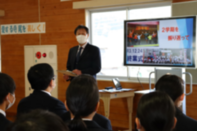 12月24日(金)は2学期の終業式でした。校長式辞では、たくさんの学校行事をスライドで一つ一つ振り返り、生徒たちの頑張りを再確認しました。また、各学年の代表生徒が意見発表を行いました。大変、中身の濃い2学期でした。そして、みな健康で終業式を迎えることができて何よりです。