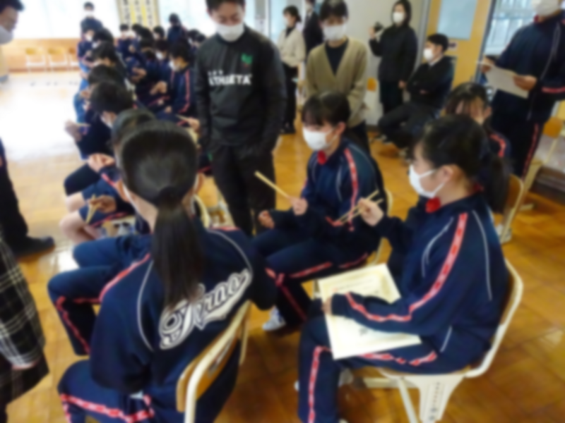 給食委員会からの発表 おはしの正しい持ち方を確認する生徒たち