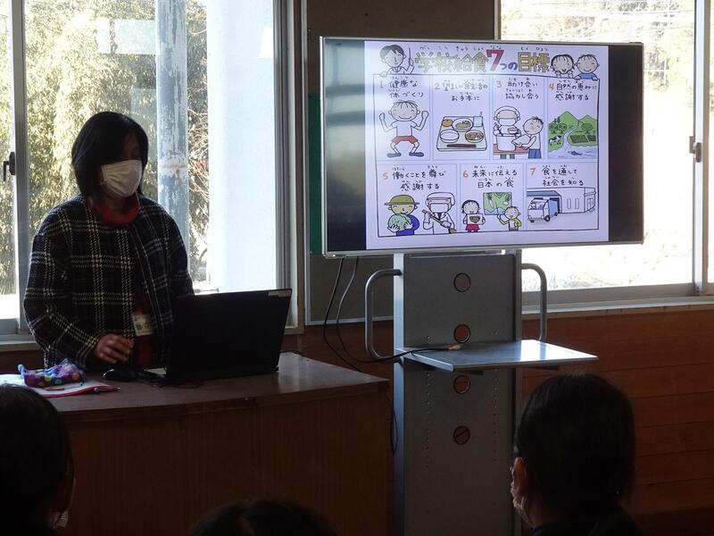 全国学校給食週間に合わせ、本校では今週(1月18日~22日)が「校内給食週間」です。昨日、本校の給食を作ってくださっている寺尾小学校給食共同調理場の栄養教諭に、学校給食についての講話をしていただきました。