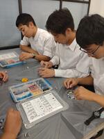 木工作の作品を作る際、より頑丈に作るための材料の組み合わせ方を先生一緒に考えていました。すぐ近くで先生の実演が見えるので生徒達もうなずきながら学習していました。