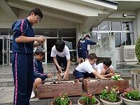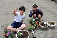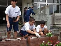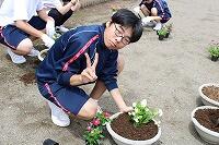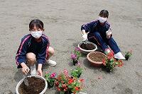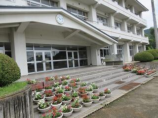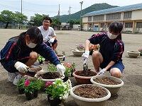 昇降口の花がきれいです。6月12日(木)に一人二鉢運動として、みんなで花を植えました。