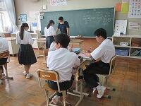 2年生は、外国語です。グループごとに、封筒の中に入っいる単語のカードを並べ替えで文章を完成させて、日本語に訳すという学習活動を行っていました。ALTの先生がヒントを出していました。カードを動かしたりすることで、みんなで考えるのにとても取り組みやすい活動になっており、楽しく学習しています。