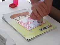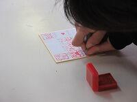篆刻した自分だけのオリジナルの印を、一人一枚ずつ配布された小さな色紙の自分の名前のところに押していきます。クラスメイトの印が集まって一枚の色紙が完成です。思い出の一枚になると思います。
