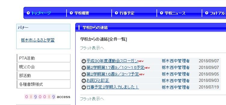 おかげさまで『19万アクセス』が達成できました!多くの方にアクセスして頂き大変ありがとうございます。時々間違いを指摘して下さる方もいて、見てくれているんだなあという実感と同時に、気を引き締めてアップしないとと反省しています。今後とも保護者や地域の皆様に栃木西中学校の活躍を発信できるように頑張りたいと思います。今後ともよろしくお願いします。 by 管理者
