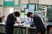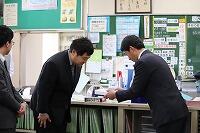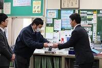 ▲任命書を手渡す小林校長先生と黒子生徒会長