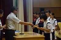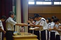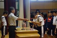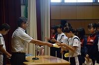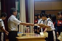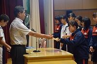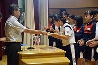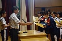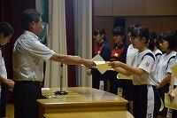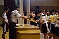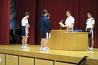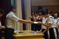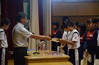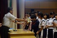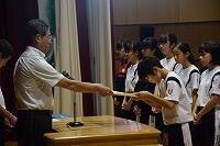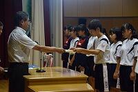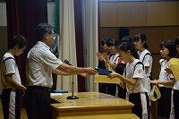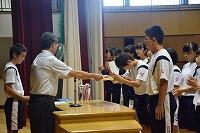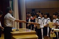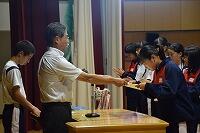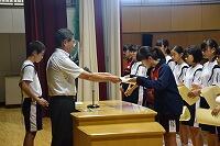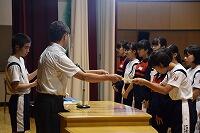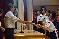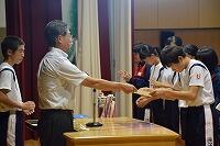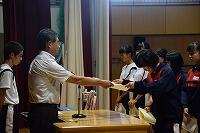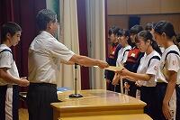 ▲任命書を手渡す小林校長先生と黒子生徒会長