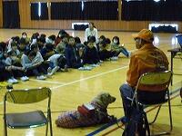 一覧へ 学校に盲導犬が来た! 投稿日時: 2018/02/16 栃木第三小管理者 2月16日(金) 栃三小に盲導犬が来校です。 栃木市で1頭だけの盲導犬、名前は「ぼたん」です。栃木市社会福祉協議会の主催する「福祉体験学習」が栃三小で実施され、そのために来校しました。待ち受けていたのは4年生です。 この学習では、盲導犬「ぼたん」を連れた坂田英樹さんが、子どもたちに盲導犬のこと、盲導犬と共に生活する毎日のことなど話してくださった後、子どもたちからの質問に答えてくださいました。盲導犬と一緒に生活する楽しみは?という質問には、「スポーツが楽しめるようになったことです」との答えでした。 お話を聞いた後、みんなで「アイマスク体験」をしました。 視覚障害をもつ方との交流は、4年生たちにとって貴重な学習となりました。 「ボタン」の頭を一人一人がなでなでしてお別れです。