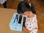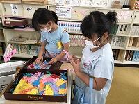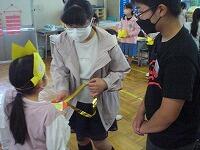 試行錯誤しながらつくったおもちゃを1年生に楽しんでもらえるようにと、やさしく説明したり、一緒に喜んだりしている2年生たちは、お兄さん、お姉さんの顔でした。