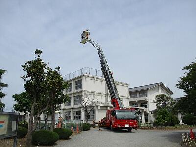 消防署には、はしご車の他に、タンク車、救助工作車も出動していただきました。
