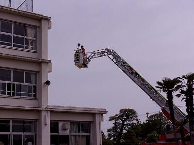 2名の教員が、屋上から救出されるという訓練です。