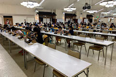 お昼は、鶴ヶ城会館でワッパ飯です。感染症対策のため、同じ方向を向いて、黙って食べています。前後の間隔は2メートル以上開いています。