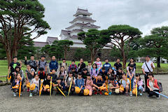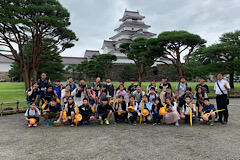 鶴ヶ城をバックに記念撮影。まずは1組