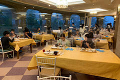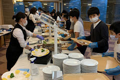 夕食です。マスクと手袋をしてバイキングです。配膳はホテルの人がしてくれます。