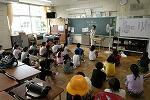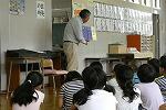 途中、3択クイズがあったり、今も残っているチャイムの代わりの鐘(手持ち)や職員用靴箱の紹介があったりして、子どもたちも興味津々に話を聞いていました。