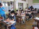 教科書や動画など視覚的な情報も得ながら、英語の発音もしっかり聞き取ろうとする子供たち。どの子も真剣に集中して学習にのぞんでいます。