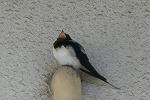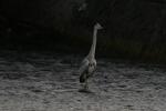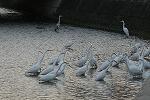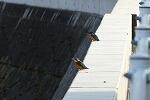 朝空を飛翔するカワウと小魚を飲み込むカワセミ