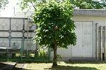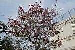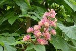 中庭に咲くベニバナトチノキ(ムクロジ目トチノキ科)のピンクの花々と、