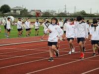 音楽に合わせて、自分のペースで走ります。最後は、整理運動。