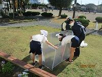 職員室前の芝生に柵を貼り、放し飼いにしました。