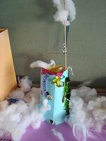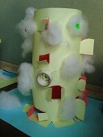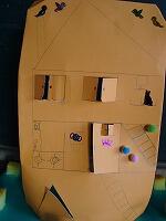 色画用紙にカッターで窓を開け、紙を立てて飾りをつけました。