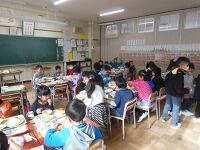6年生全員が順番に校長室で校長先生との会食を行っています。はじめはとても緊張している様子ですが、1人1人校長先生とお話できて、食事の後には地図を広げて談笑したりと、とても楽しそうです