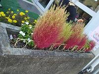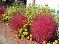 真夏に緑色でもこもこと育っていた、コキアが秋風を受け真っ赤に色づき始めました。