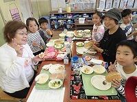 1、2年生にお孫さんがいる、おじいさん、おばあさんに来ていただき、子どもたちと一緒に給食を食べていただきました。