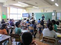 パワーポイントを使って、1学期の児童の頑張りの様子を写したり、めあての反省をしたりしました。子どもたちは、校長先生の問いに、すぐ反応しながら、しっかり話を聴きました。