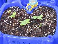 朝顔のかわいい芽が出て、みんな喜んでいます。何個の芽が出たか先生に報告したり、熱心に観察したり・・・