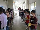 並んで登校。学年ごとに、一列になって・・・消毒してから、校内へ入ります。