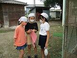 ウサギ小屋で、チョコとライオンの様子を見守る子供たち。