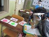 フェイスシールドをして,友達の作品の鑑賞をしています。
