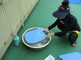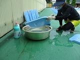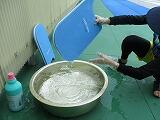 ビート板を使ったあとは、たらいに次亜塩素酸ナトリウムを入れて、1枚1枚消毒しています。