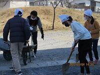 6年の先生方、6年生が進んで手伝ってくれ、砂利を敷くことができました。