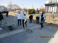 一輪車に砂利を乗せて運び、平らにしました。校長先生はじめ、