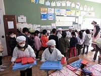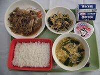 ごはん、牛乳、牛丼の具、白菜ともやしの和え物、にらたま汁、とち介いちごゼリーでした。