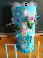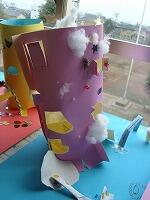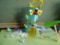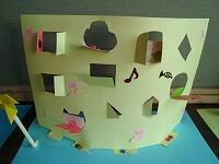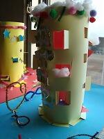 色画用紙にカッターで窓を開け、紙を立てて飾りをつけました。
